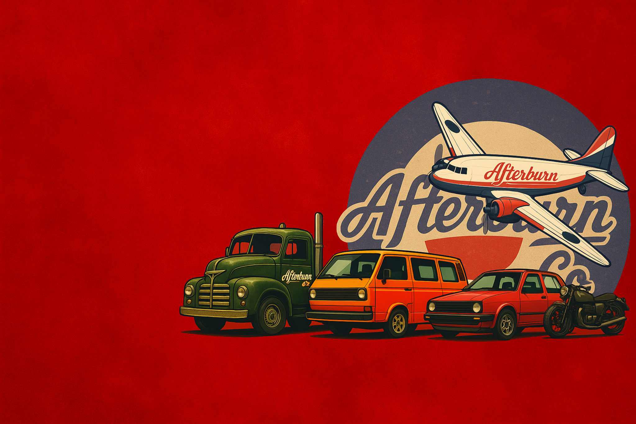 From vintage horsepower to air-cooled icons, every Afterburn Co. tee and hoodie captures the soul of motion — cars, bikes, vans, and aircraft drawn in bold, retro-modern style. Designed for those who crave speed, craftsmanship, and stories behind the machines.